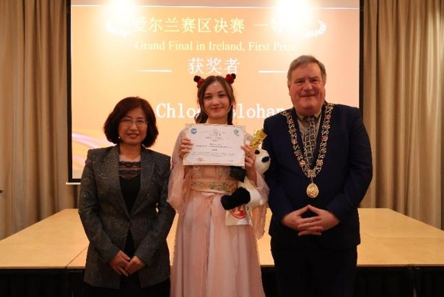 科克市市长Cllr. Dan Boyle先生和中国驻爱尔兰大使馆负责教育事务一等秘书朱喜坤女士为一等奖获奖选手Chloe Holohan颁奖